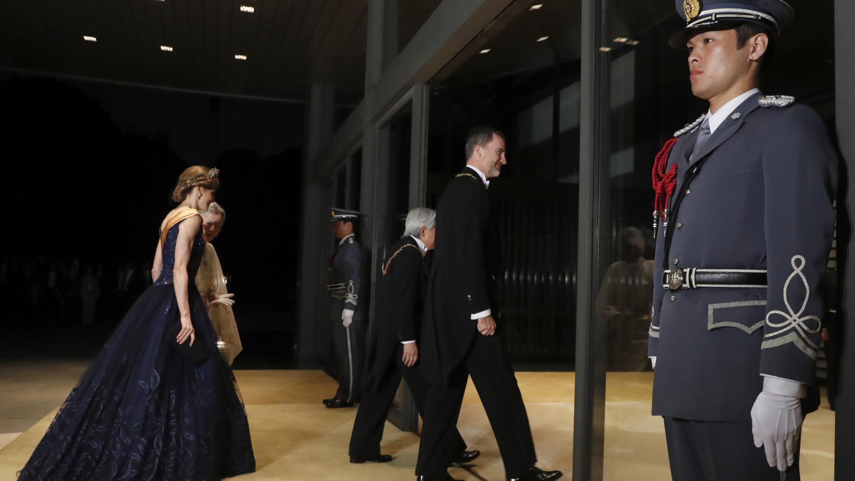 Los reyes Felipe VI y Letizia a su llegada a la cena de gala en el Palacio Imperial en Tokio (Japón).