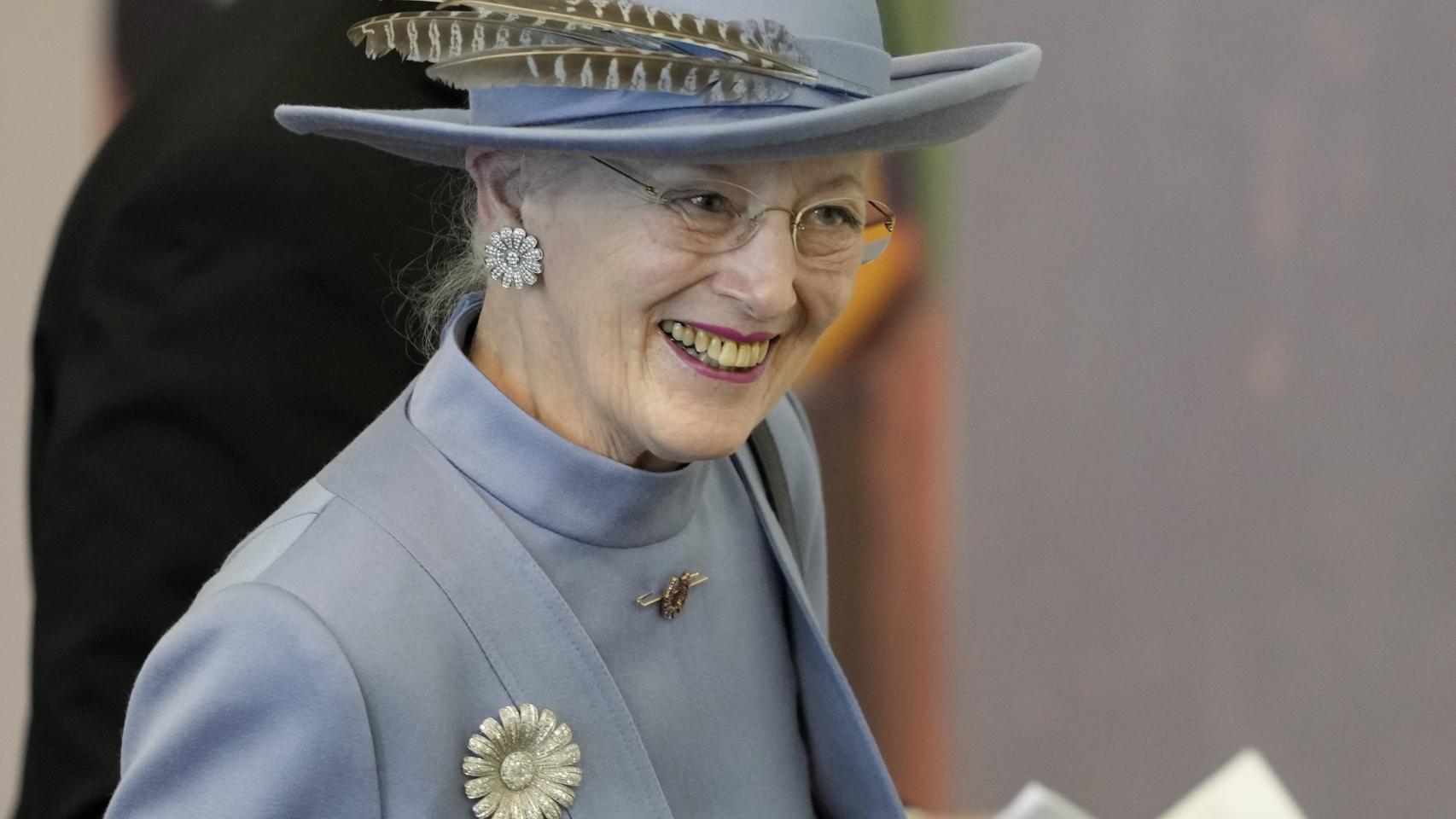 Para su Jubileo de Oro, la reina Margarita II de Dinamarca ha seleccionado un vestido en color celeste cielo, quizá un guiño a la bandera de su tierra. Para protegerse del frío danés, ha recurrido a un abrigo largo que pudiera parecer de visón y un sombrero de la misma piel. Como complementos, sencilla en lo relativo a zapato, casi plano, y un bolso negro acolchado con cadera dorada. Lo más impresionante, sus joyas: pendientes de brillantes y el broche floral de la reina Margarita.