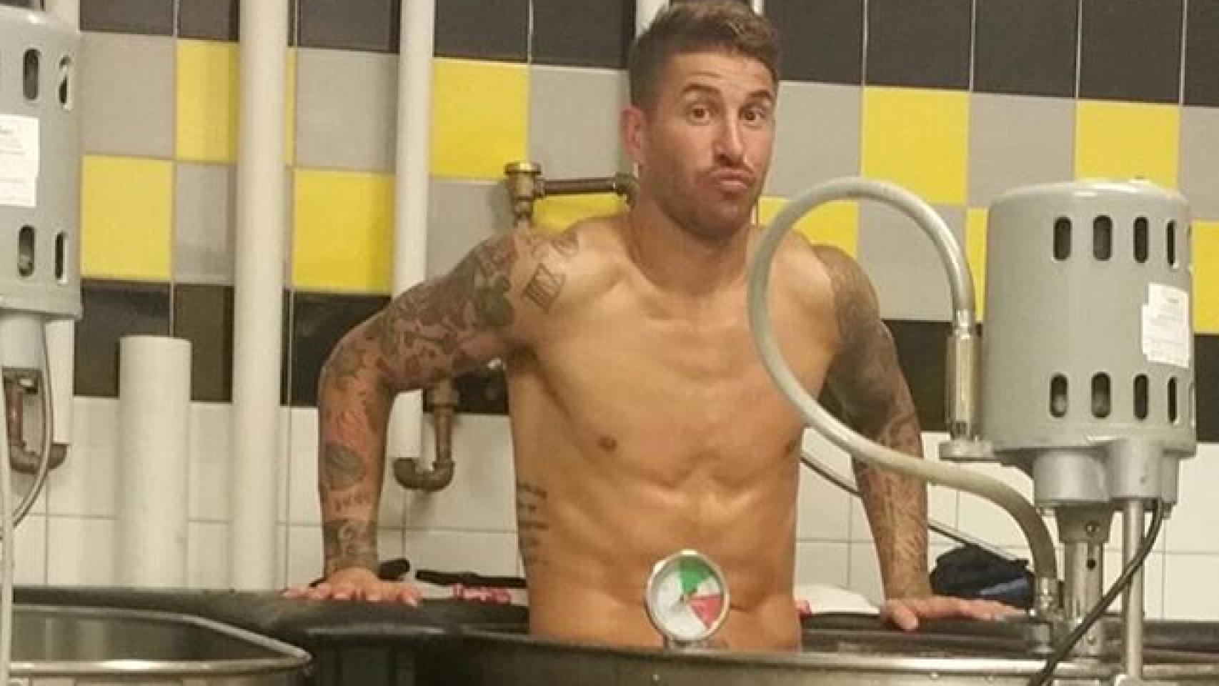 Sergio Ramos ha subido esta curiosa imagen a sus redes sociales metido en una máquina de agua fría después de una fuerte sesión de trabajo , como ha explicado el futbolista.