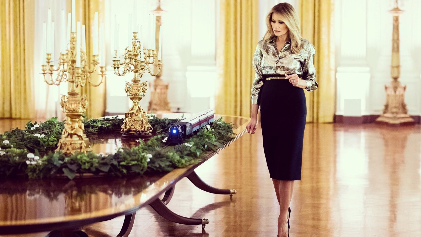 A Melania le gusta recargar los salones y que no queden dudas de que se acerca la Navidad. Es capaz de llenar un salón gigante como el de la imagen con al menos cuatro árboles de navidad repletos de luces parpadeantes.
