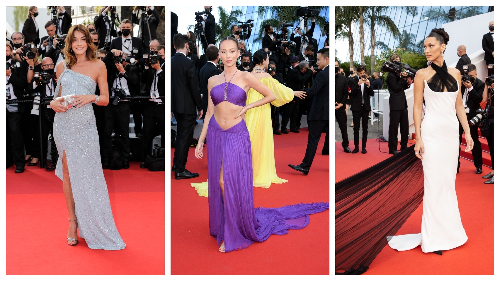 Una de las apariciones más esperadas era la de Bella Hadid, que se ha decantado por el binomio de color más clásico: el blanco y negro. La modelo ha escogido un diseño de Jean Paul Gaultier que combina una pieza estructurada en color blanco, que destaca las curvas de su silueta, con una delicada gasa que parte del escote, formando un escote halter y se desliza por la espalda formando una gran cola. La hermana de Gigi Hadid ha recogido su melena en un pulido moño y ha complementado el diseño con joyas de Chopard.