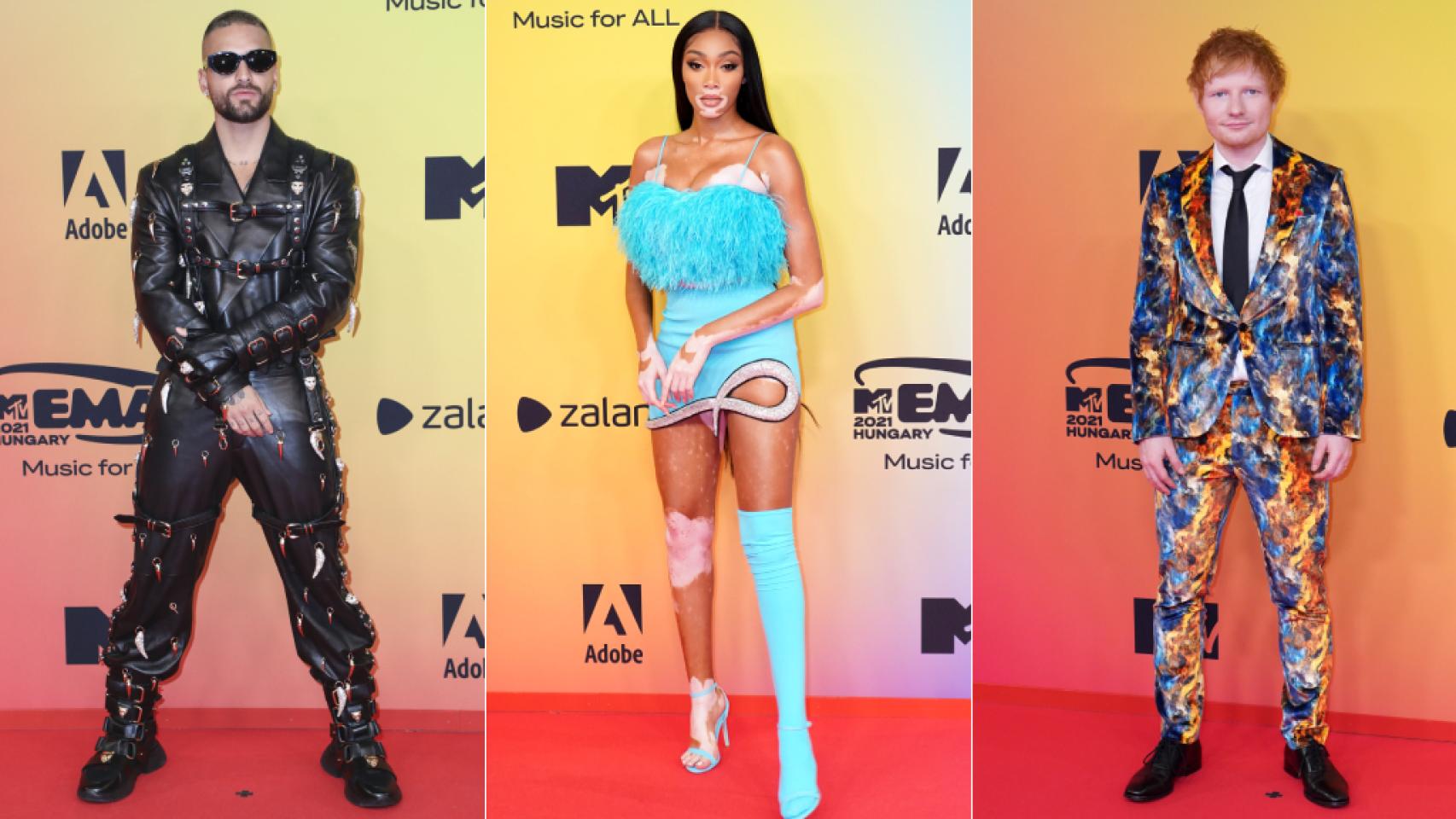El intérprete de 'Shape of you' fue quien le dio el toque colorido a la alfombra roja de los MTV EMA 2021 al decantarse por un traje que se desmarcaba por completo de lo clásico. El artista apostó por un colorido 'look' de pantalón y chaqueta estilo 'tie dye' que llamó la atención de todos.