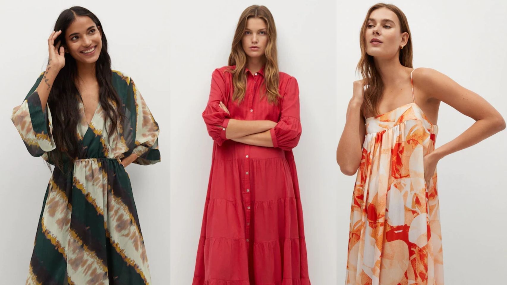 Con unos tonos y estampados más veraniegos se presenta este vestido de largo midi, escote recto y falda acampanada. Una prenda idónea para lucirla en los días más calurosos combinada con unas sandalias.