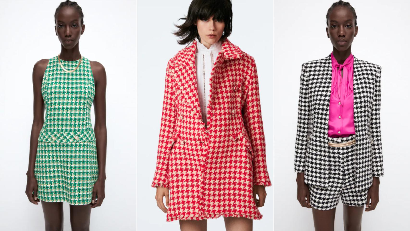 Es ideal si se quiere apostar por estilo clásico de tejido pata de gallo, sin dejar a un lado el toque de color. El modelo es de cuello y solapa, con manga larga y hombros marcados. Tiene, además, bolsillos delanteros, bajo con abertura en la espalda y cierre frontal cruzado con botones metálicos. También está disponible en tono rosa.