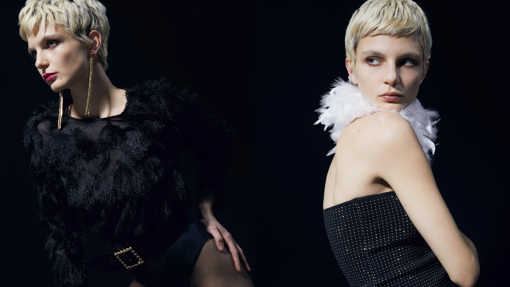 La marca presenta a una de sus modelos con un estilismo sencillo pero que bien podría ser de alfombra roja. Con solo un bandeau -top palabra de honor- con pequeñas piedras incrustadas que cuesta 17,99 euros se puede conseguir captar todas las miradas en una noche festiva. Más aún si se le añaden complementos como plumas y pantalones anchos de terciopelo negro, de 23,99 euros.