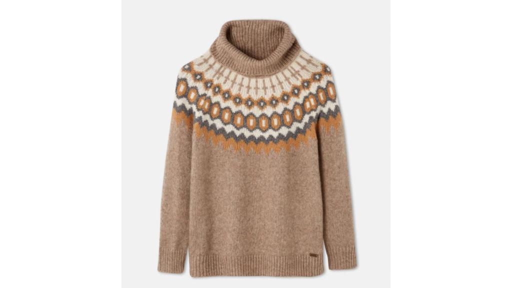 Para aquellos busquen una prenda que regalar más acorde con las fechas, te recomendamos este jersey de 100% algodón de la marca Dustin con un estilo algo más navideño. Destaca por su diseño multicolor, con estampado alpino y cuello alto. Es ideal para combinar con pantalones o vaqueros.
