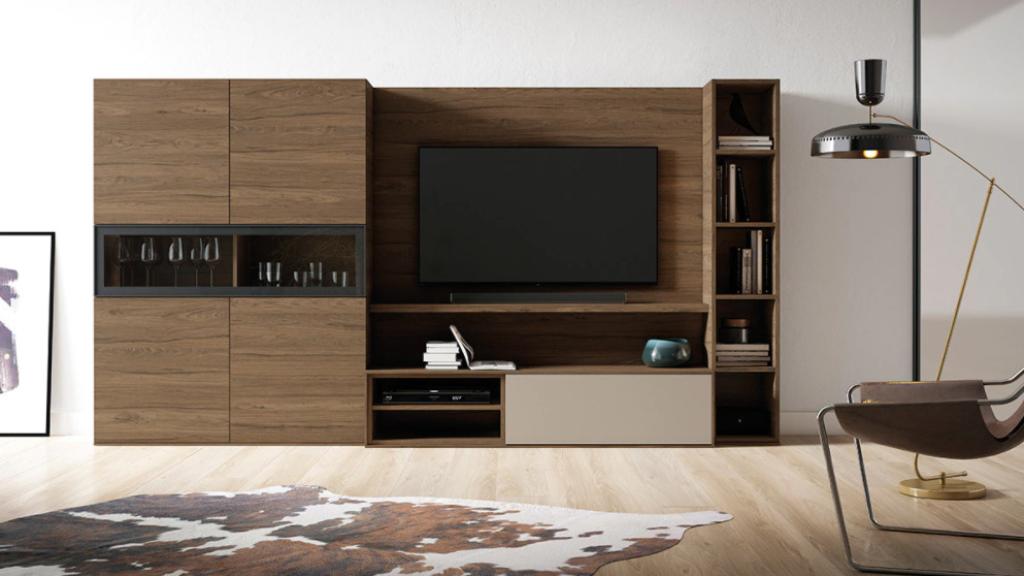 Otro diseño que aportará luminosidad a tu estancia es este mueble de salón formado por un módulo especial para la TV, una columna con puerta abatible y vitrinas con puertas elevables de cristal smoke que aportarán un toque más elegante. Al estar compuesto por colores neutros que te aportarán tranquilidad y bienestar cuando estés descansando, también puedes añadir piezas de decoración que destaquen más.
