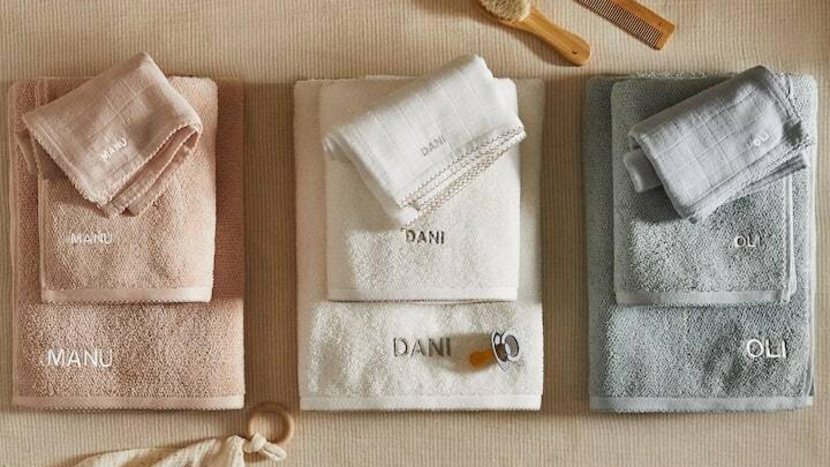 Imposible confundirse con este juego de toallas personalizable que permite bordar el nombre de su propietario. Disponibles en tres colores, rosa, azul y crudo, están a la venta en dos tamaños -lavabo y ducha- así como en una gasa para los más pequeños.