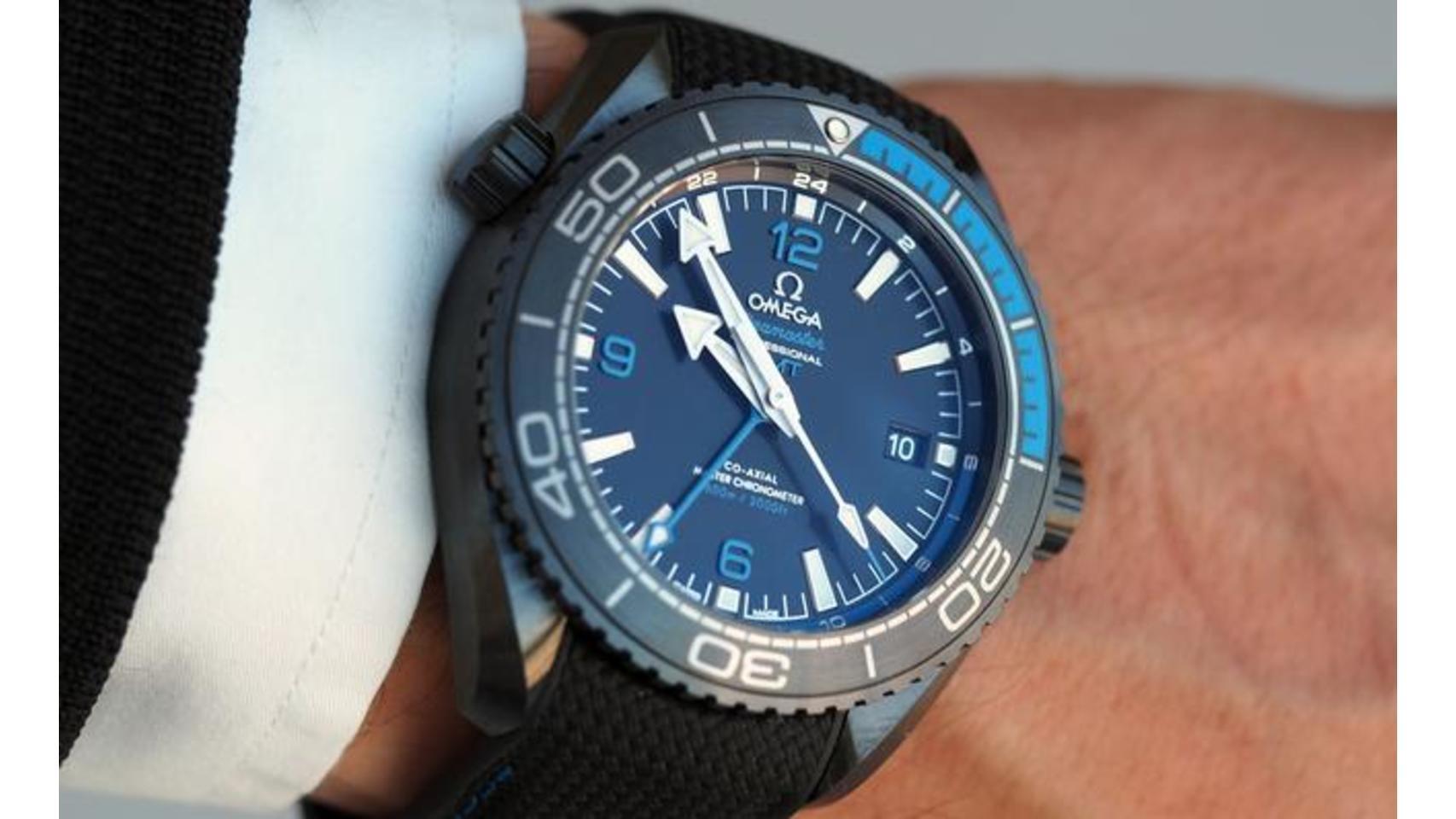 Con efecto brillo o mate (para mejor visibilidad bajo el agua) la cerámica negra se combina con una pulsera de caucho. Se presenta en cuatro acabados: negro, oro, rojo o azul; cada variante es más sorprendente que la anterior. Elige la que más te guste para emprender una aventura subacuática. Tu Omega te acompañará hasta los 600 metros bajo la superficie del mar. Precio: 10.500 €.