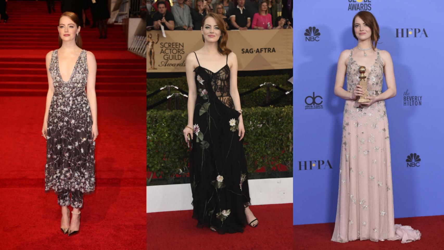 Emma Stone de Chanel Couture en los Premios Bafta este mismo año, de Alexander McQueen en los Premios del Sindicato de Actores (SAG) y de Valentino, haciendo un pequeño película por la que se haría con el premio "La La Land" en los Globos de Oro de enero.