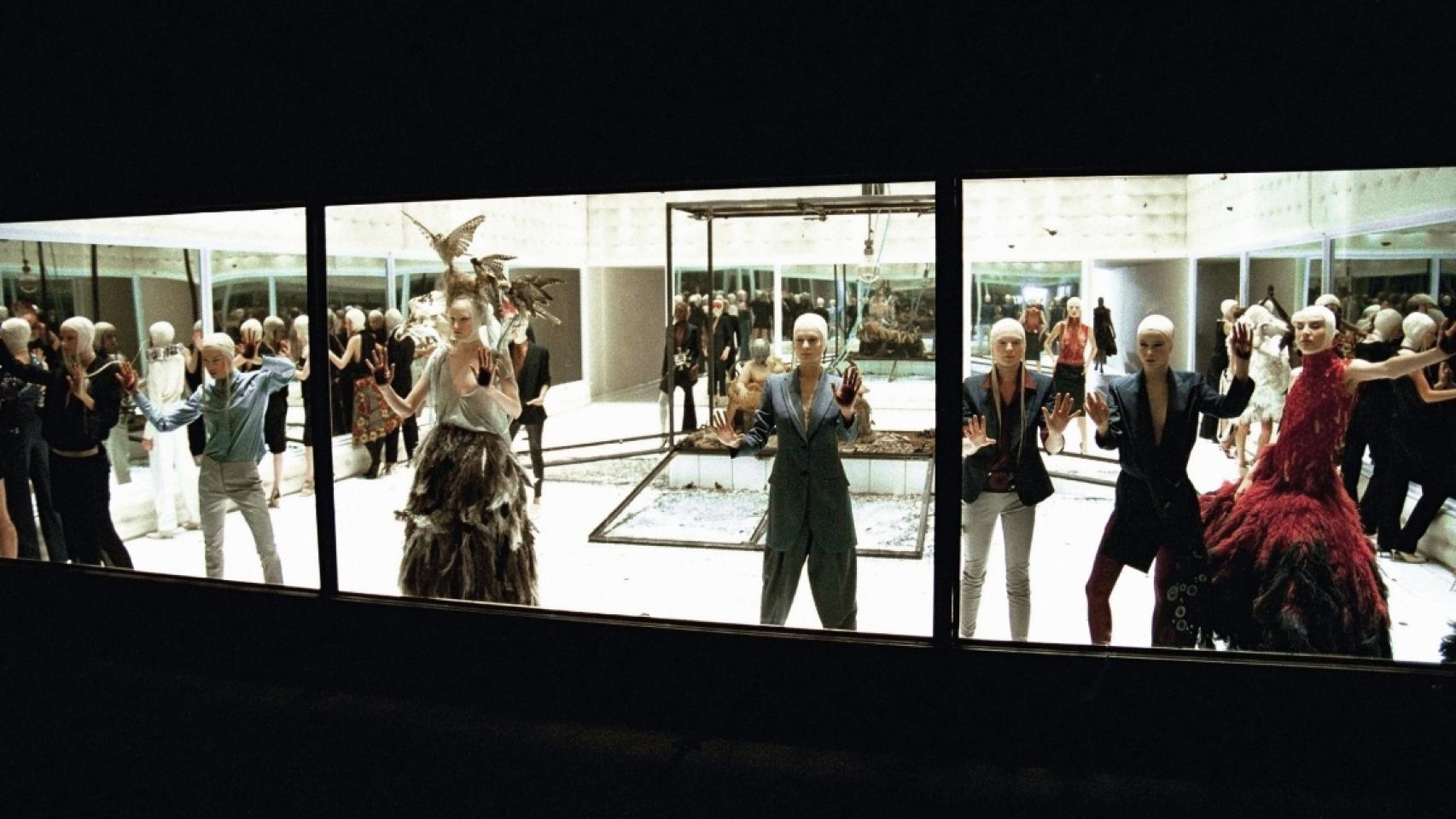 El desfile de la colección "Savage Beauty" de Alexander McQueen tuvo lugar entre cuatro paredes ficticias con ventanas colocadas sobre la pasarela, donde las modelos se apoyaban para mostrar la colección.