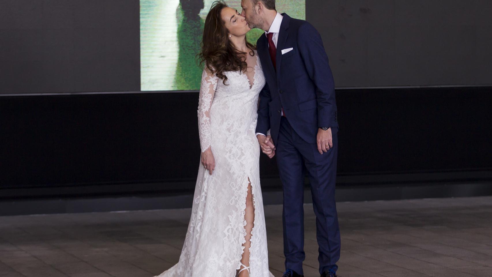 Alexis Marí recibió a todos los invitados mientras en una pared se mostraban imágenes de la pareja