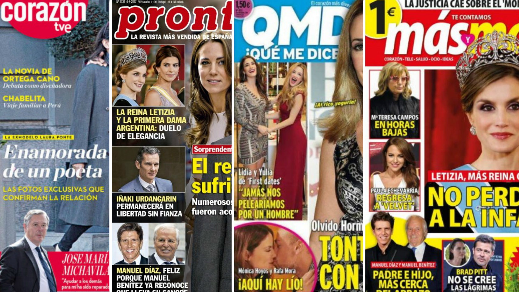 Más y más lleva a su portada a la reina Letizia en una semana en la que se ha conocido el desenlace de la trama Nóos. También se hace mención a la delicada situación profesional de María Teresa Campos y a la relación cada vez más cercana de Manuel Benítez con su hijo Manuel Días El Cordobés.