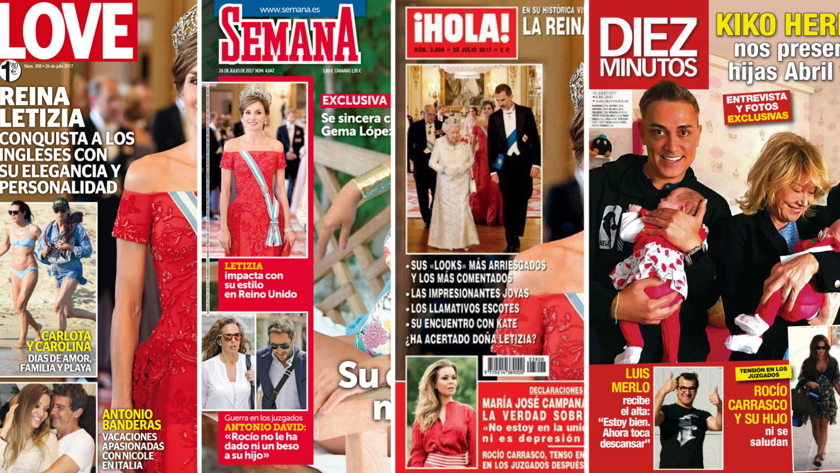 ¡HOLA! llena su portada con el rostro de la reina Letizia en su visita a Buckingham Palace. María José Campanario también es otra de las protagonistas de la primera plana.