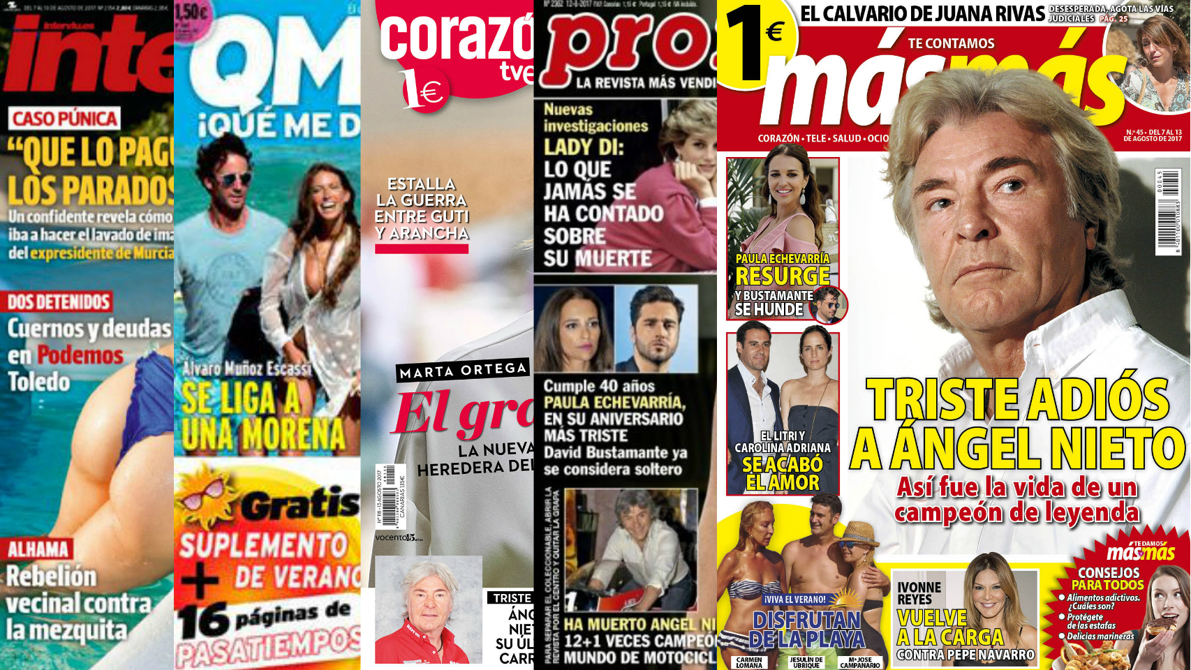 Más y Más apuesta por la repentina pérdida del 12+1 campeón, Ángel Nieto. Paula Echevarría y David Bustamante y su separación interminable son otro de los temas de portada. También el divorcio de Adriana Carolina Herrera y el Litri.