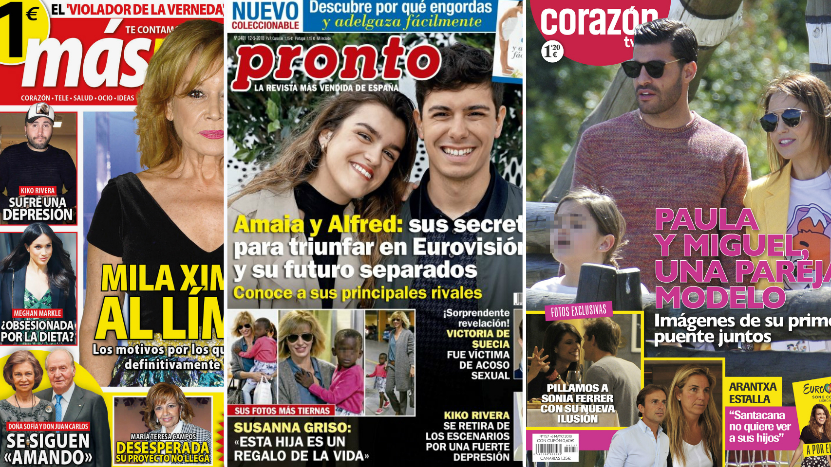 'Más y más' presenta en primera plana a Mila Ximénez. La colaboradora está pensando en abandonar 'Sálvame' porque ya no se siente cómoda en el formato y ha llegado a su límite de fuerzas. Kiko Rivera tampoco pasa por su mejor momento, y Meghan Markle parece estar muy obsesionada con la dieta de cara a su próxima boda el 19 de mayo con el príncipe Harry de Inglaterra. Y la revista también afirma que el rey Juan Carlos y la reina Sofía se "siguen amando", mientras María Teresa Campos espera que llegue a sus manos al fin un proyecto profesional.