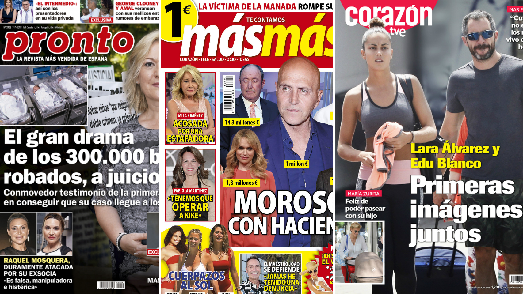 La revista 'Más y más' lleva en su portada a los famosos que aparecen en la lista de morosos de Hacienda. Entre ellos, Kiko Matamoros, Patricia Conde, Luis Miguel Rodríguez 'El Chatarrero' o el estreno de Miguel Bosé. Mila Ximénez, por su parte, vive una pesadilla por la detención de Mónica Gil, la estafadora que consideraba su amiga; y Fabiola Martínez asegura que este verano operarán a su hijo KIke. El maestro Joao también tiene un hueco en la primera plana y declara que "nunca ha tenido una denuncia".