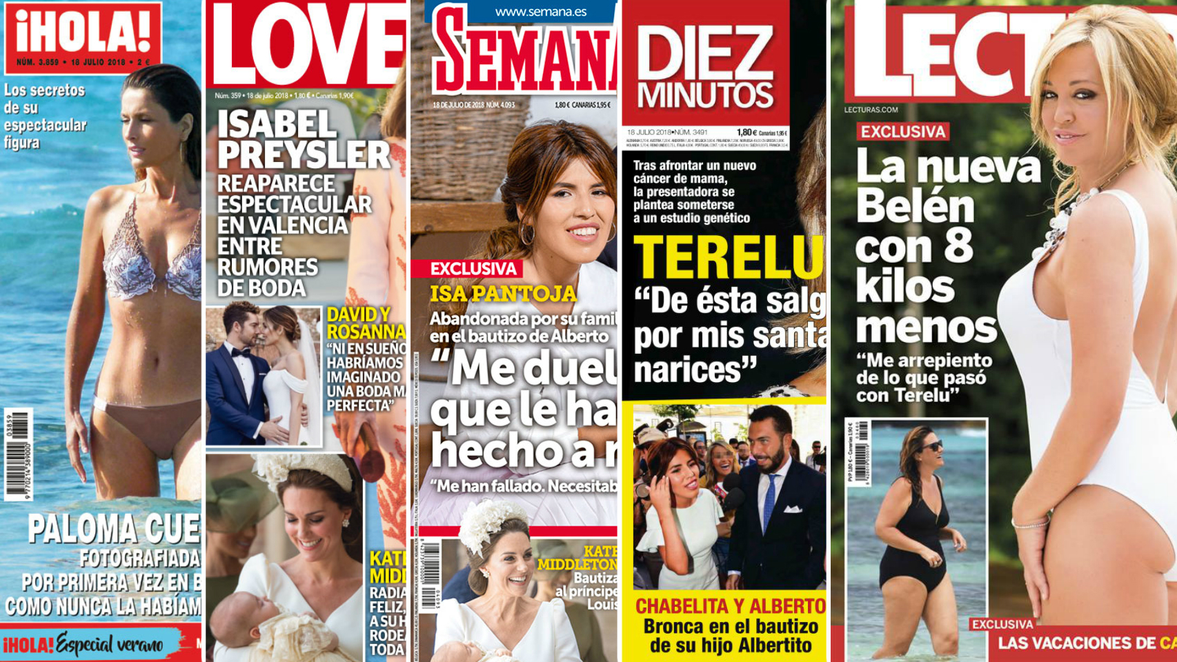 '¡HOLA!' muestra en su portada a Paloma Cuevas en bikini luciendo una figura espectacular. La revista tampoco deja de lado la enfermedad de Terelu y recoge sus últimas declaraciones antes de la operación así como el mensaje de apoyo de su hija. La publicación cede un hueco al bautizo del príncipe Louis y recalca los estilismos de Kate Middleton y Meghan Markle.