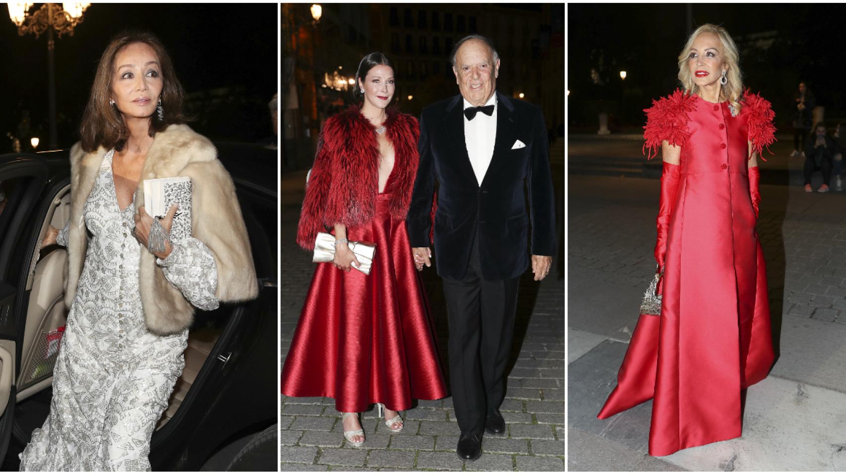 La mujer del marqués de Griñón sacó toda la artillería estilística para la gala. Un marcado escote, cintura entallada, falda de vuelo en seda y un abrigo de peletería. Todo ello en rojo y firmado por Hannibal Laguna. En sus complementos -pendientes, colgante y bolso- optó por el brillo plateado. Su marido lució terciopelo en la americana del traje negro, combinado con pajarita en el mismo tono.