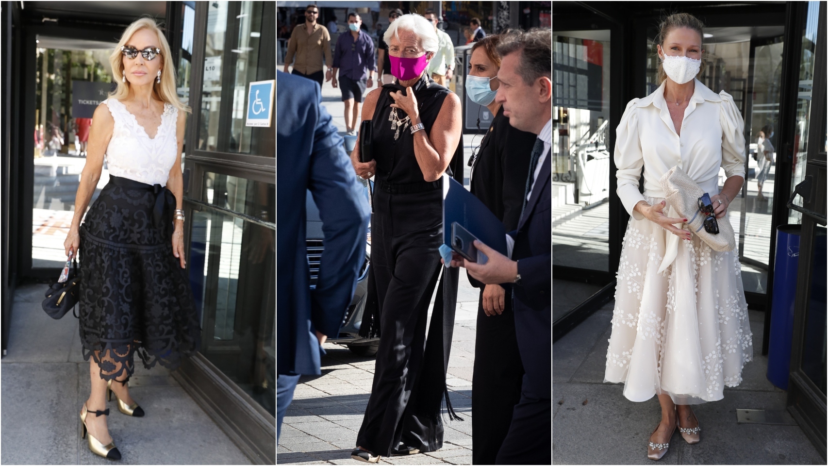 La presidenta del Banco Central Europeo seleccionó un atuendo sobrio y elegante para disfrutar de la ópera en Madrid. Con blusa sin mangas en color negro y pantalón del mismo tono, Lagarde rompió la templanza del 'look' luciendo una mascarilla en color buganvilla y complementos en plata, además de un chal a modo de capa.