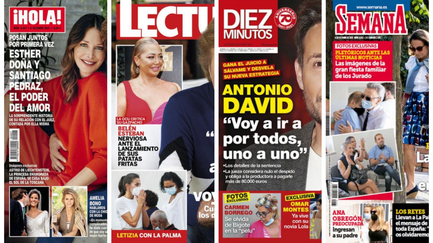 Esther Doña y el juez Santiago Pedraz protagonizan la portada de esta semana en la cabecera rosa. Posan por primera vez y revelan los detalles de su historia de amor. En la primera plana de la revista también destaca Amelia Bono, hija del exministro José Bono, que se ha convertido en la 'mujer de moda'. Además, la publicación recoge las imágenes y las anécdotas más románticas de las dos bodas del fin de semana pasado: la de la princesa Astrid de Liechtenstein con Ralph Worthington, y la de Jaime de Borbón-Dos Silicias con lady Charlotte Lindesay-Bethune.