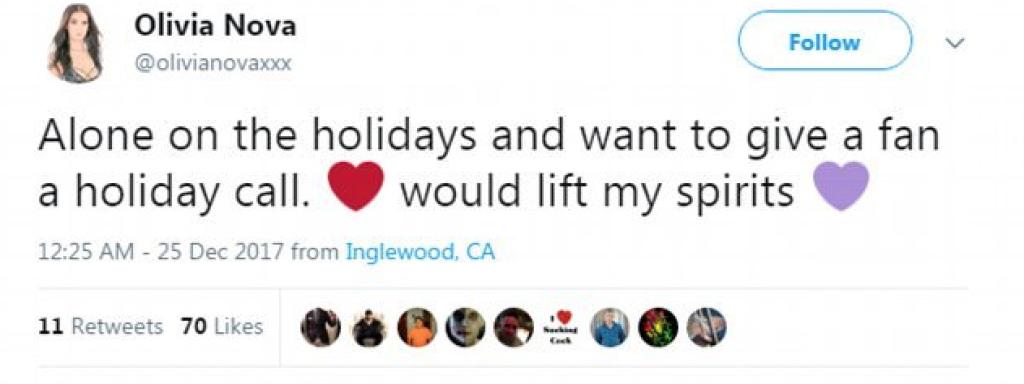 En Navidad, Nova publicó en Twitter que estaba pasando las vacaciones sola. El mensaje decía que quería "llamar a un fan" para "levantar el ánimo".