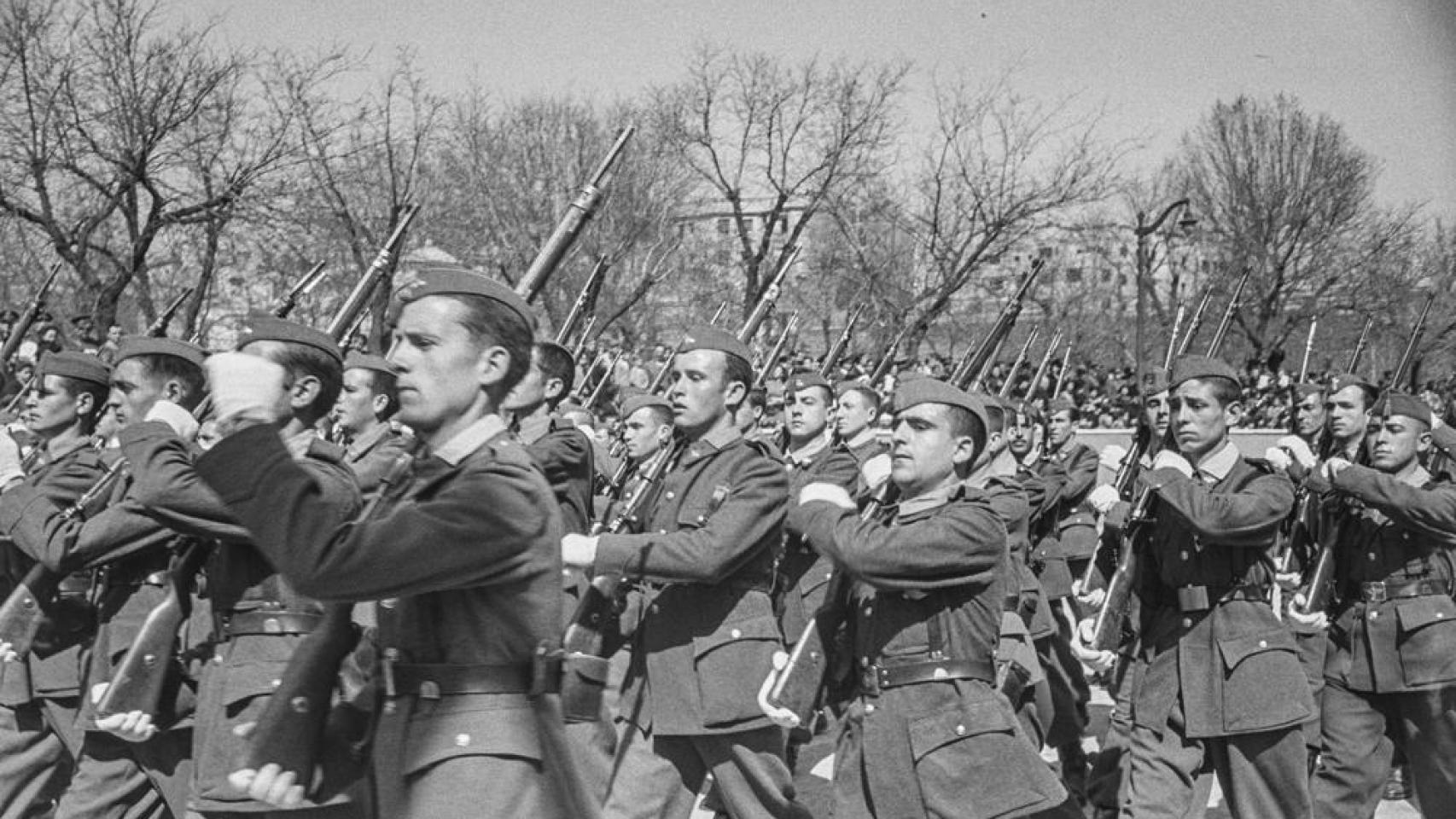 Soldados desfilando por las calles de Madrid. Abril de 1942
