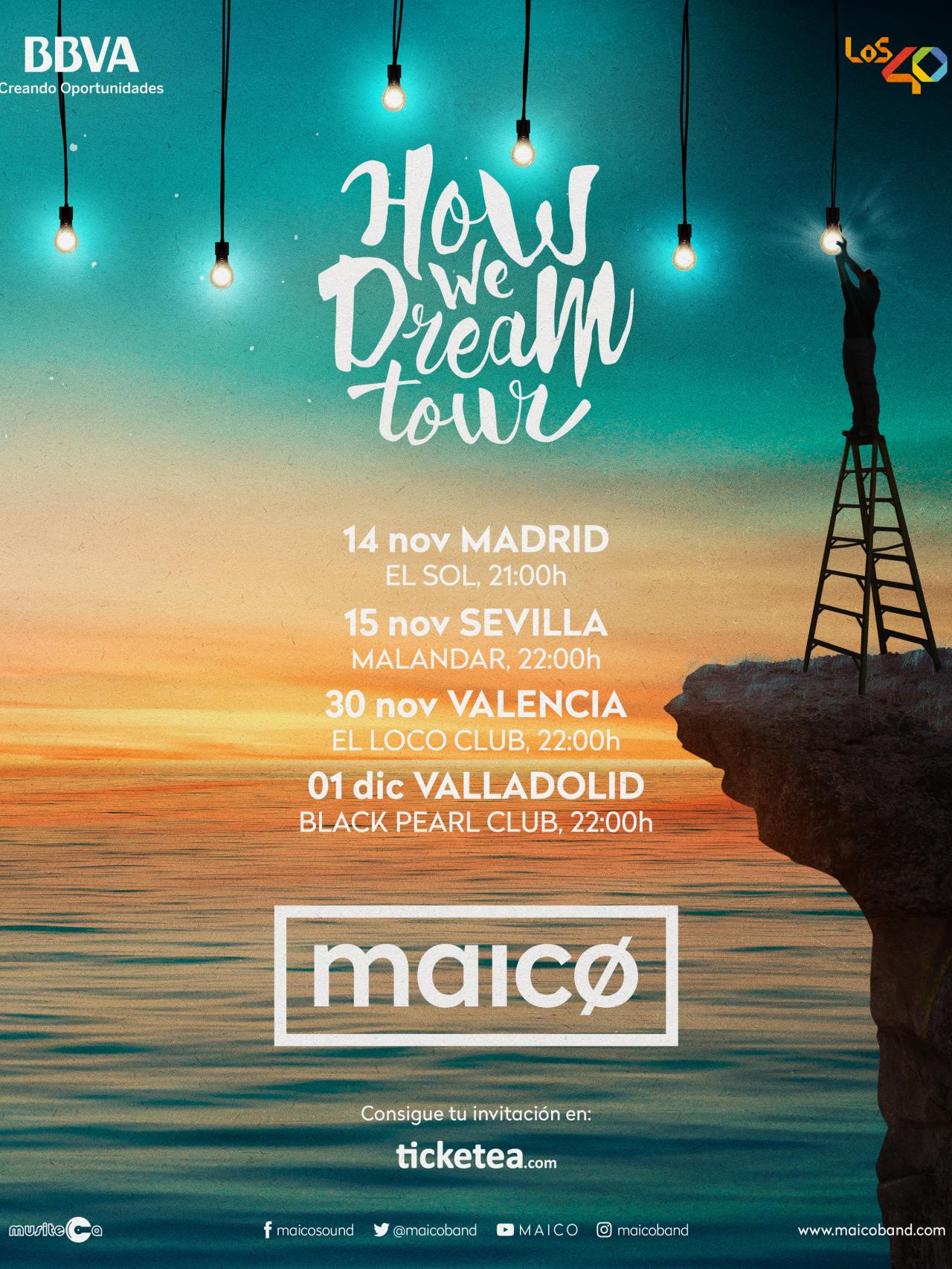 Paso a paso, Maicø se llena de argumentos para alcanzar tales cotas. Sin prisa pero sin pausa, será fácil que con el tiempo todos conozcamos sus canciones. De momento, su agenda está bien cargada. La próxima semana inician su gira How we dream de la mano de BBVA y de Los40. Tendrán conciertos en Madrid (día 14), Sevilla (15), Valencia (30) y Valladolid (1 de diciembre). Las invitaciones ya están disponibles en Ticketea, así que si quieren oír cómo se sueña en directo, no lo duden.