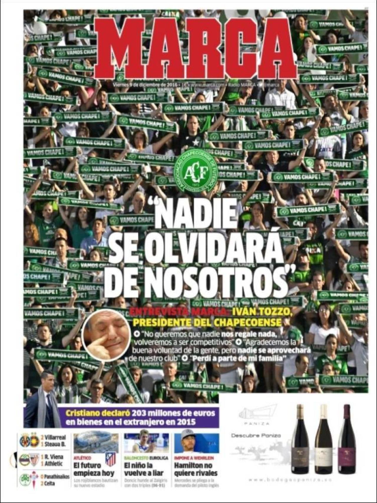 MARCA dedica buena parte de su tapa al Chapecoense, ya que entrevista a su presidente.