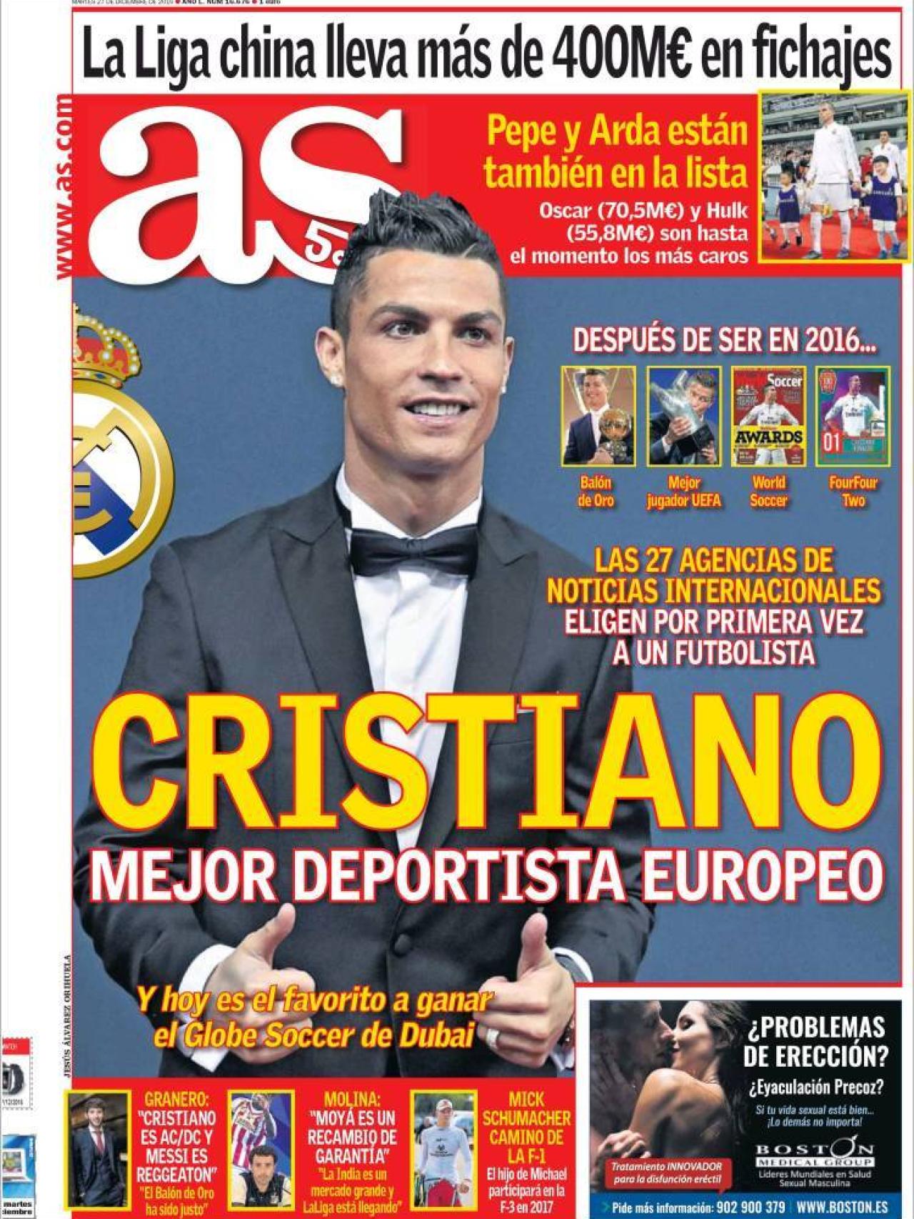 AS abre con el premio de las 27 agencias de noticias internacionales y su premio a Cristiano como mejor deportista europeo del año.