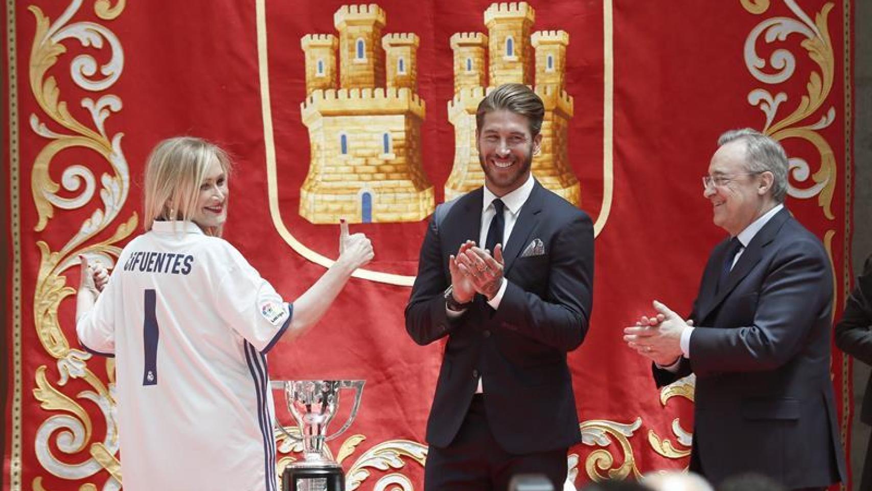 Sergio Ramos le da la camiseta del Real Madrid a Cristina Cifuentes, presidenta de la Comunidad.