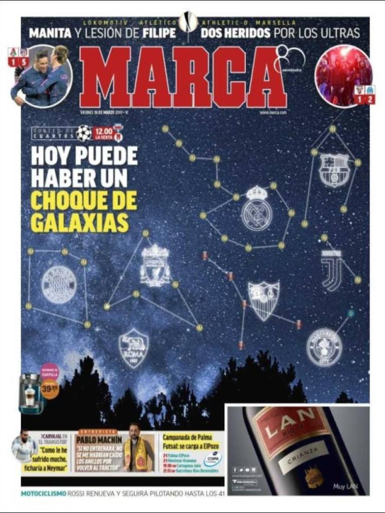 El sorteo de cuartos de final de la Champions acapara casi toda la portada de MARCA.