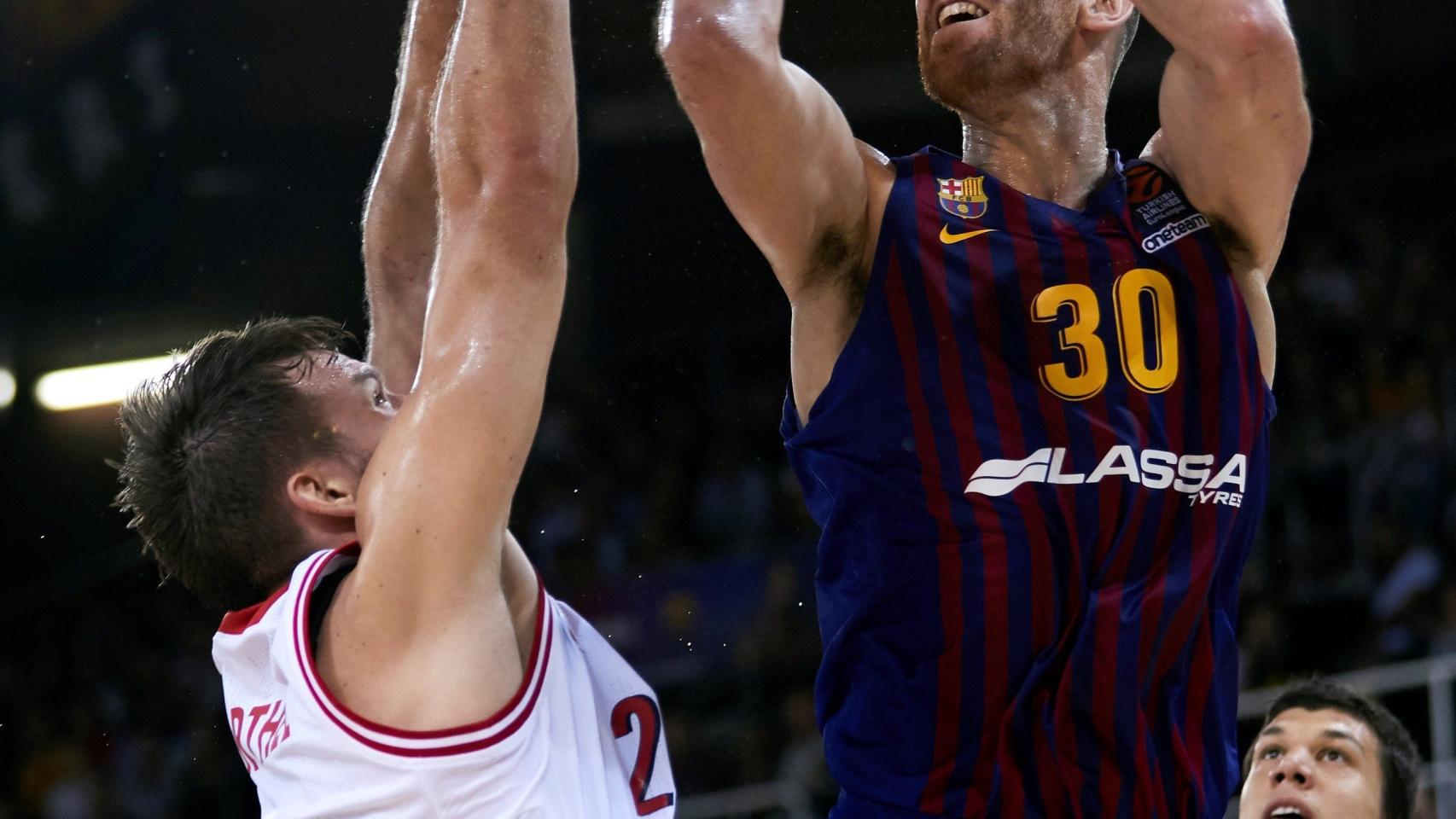 El ala pivot del Bayern Munich Danilo Barthel (i) defiende al alero del Barcelona Víctor Claver, durante el partido de Euroliga en el Palau Blaugrana.