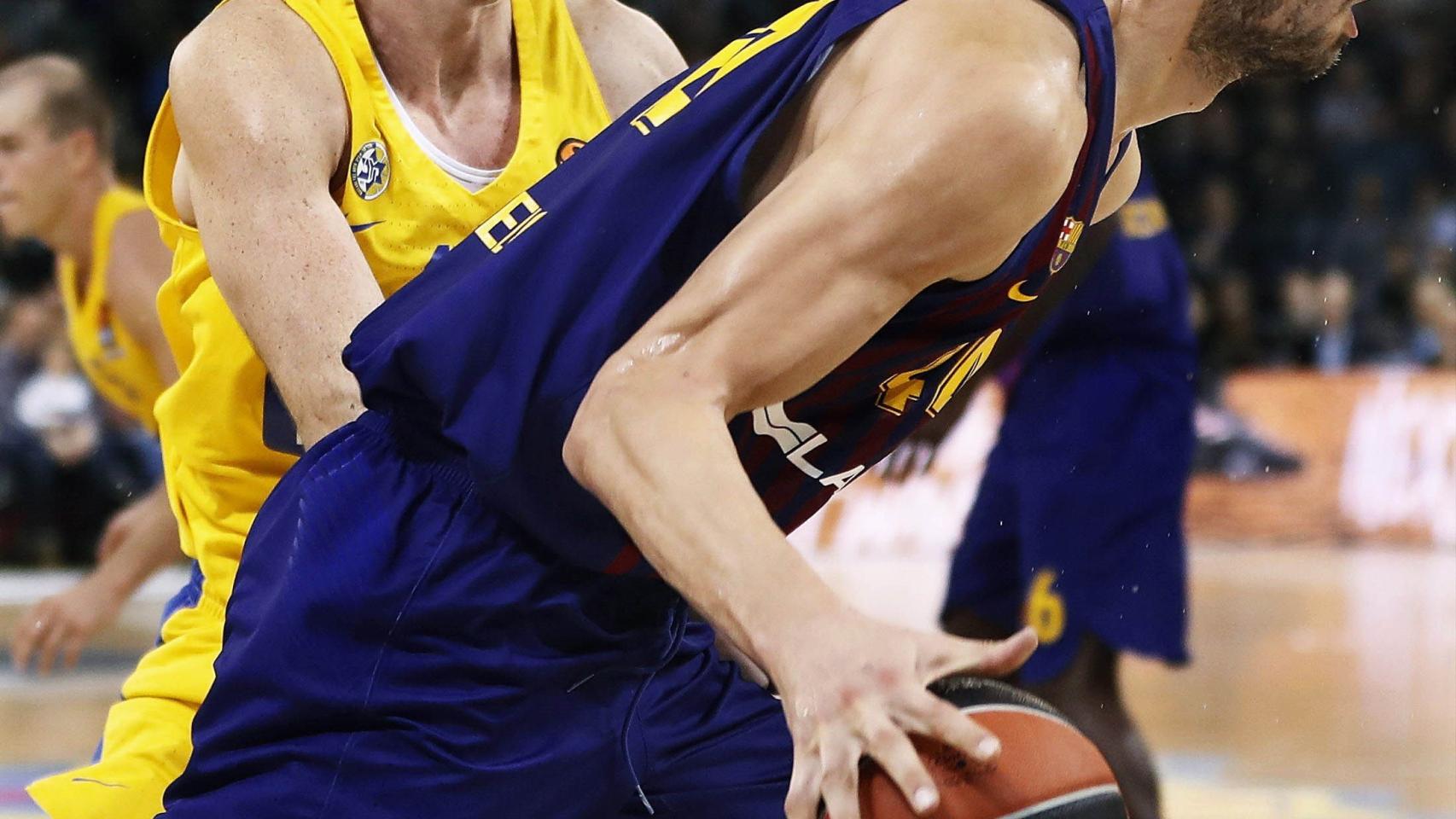 El alero estadounidense del Maccabi Tel Aviv Johnny O'Bryant (I) juega la pelota ante Ante Tomic, del FC Barcelona Lassa, durante el partido de la quinta jornada de la Euroliga de baloncesto disputado esta noche en el Palau Blaugrana, en Barcelona.