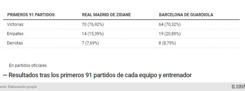 Más de año y medio después, el Madrid no solo ha conseguido a su Guardiola sino que amenaza con superarle. Para saberlo, habrá que juzgarlo a los cuatro años, tiempo que duró Pep. Por ahora, la comparación beneficia a Zidane. El actual Madrid engulle al Barça de Pep y lo hace en todos los datos: títulos, partidos, victorias, goles... y hasta en pases y posesión.