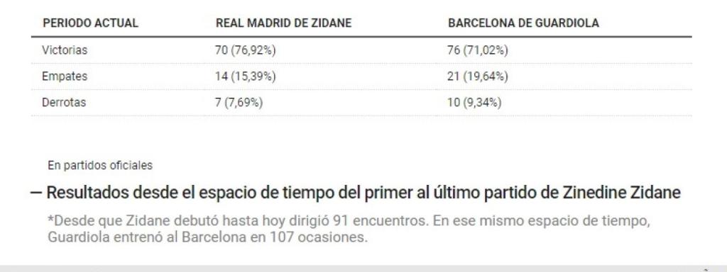 Si diseccionamos los datos por partidos, Zidane ha dirigido al Madrid en 91 encuentros con 70 victorias, 14 empates y siete derrotas (tiene los mismos títulos que partidos perdidos). Eso equivale a un 76,92% de victorias y tan solo un 7,69% de derrotas. Guardiola, en este mismo periodo de tiempo, entrenó al Barcelona en 107 ocasiones, con un resultado de 76 victorias (71,02%), 21 empates (19,64%) y 10 derrotas (9,34%).
