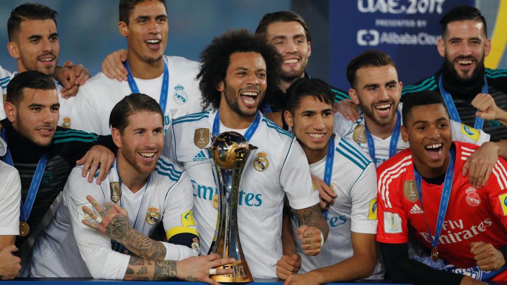 Los jugadores del Real Madrid posan con el título del Mundial de Clubes.
