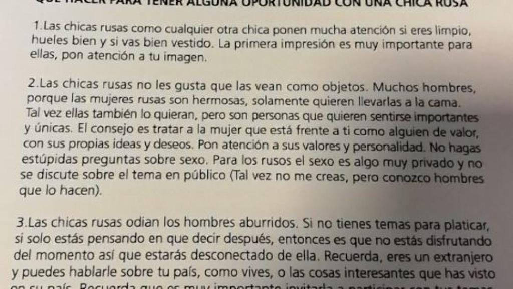 Dentro de un capítulo que tiene de nombre 'Qué hacer para tener alguna oportunidad con una chica rusa', dan consejos para ello: "Las chicas rusas no les gusta que las vean como objetos" (...) son personas que quieren sentirse importantes y únicas". Incluso dan consejos para conversar: "Recuerda, eres un extranjero, y puedes hablarle sobre tu país".