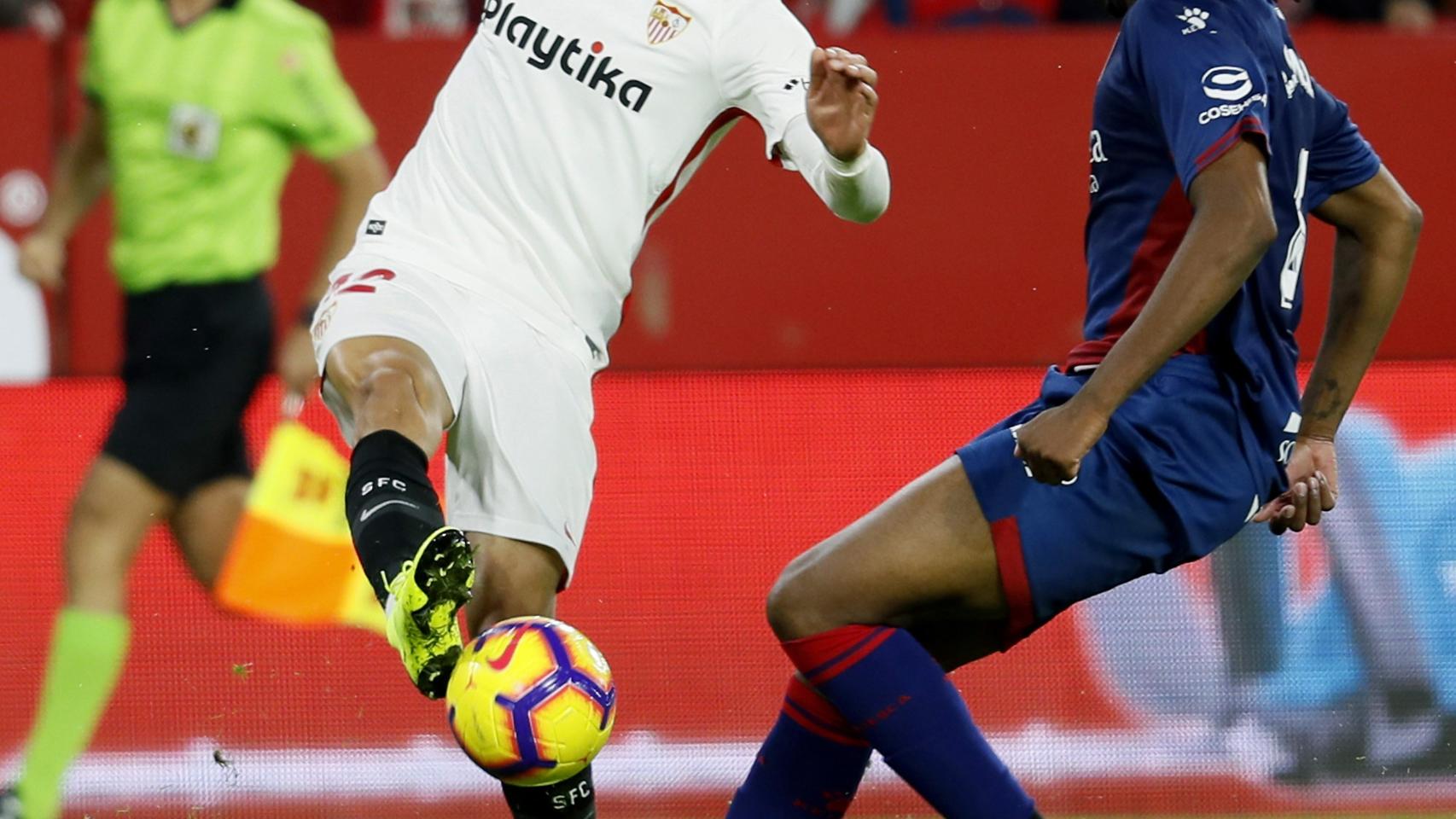 El centrocampista del Sevilla Jesús NAvas (c) con el balón ante el defensa del huesca Xabier Etxeita (d) durante el partido de la décima jornada de Liga en Primera División que Sevilla FC y SD Huesca juegan esta noche en el estadio Ramón Sánchez-Pizjuán, en Sevilla.