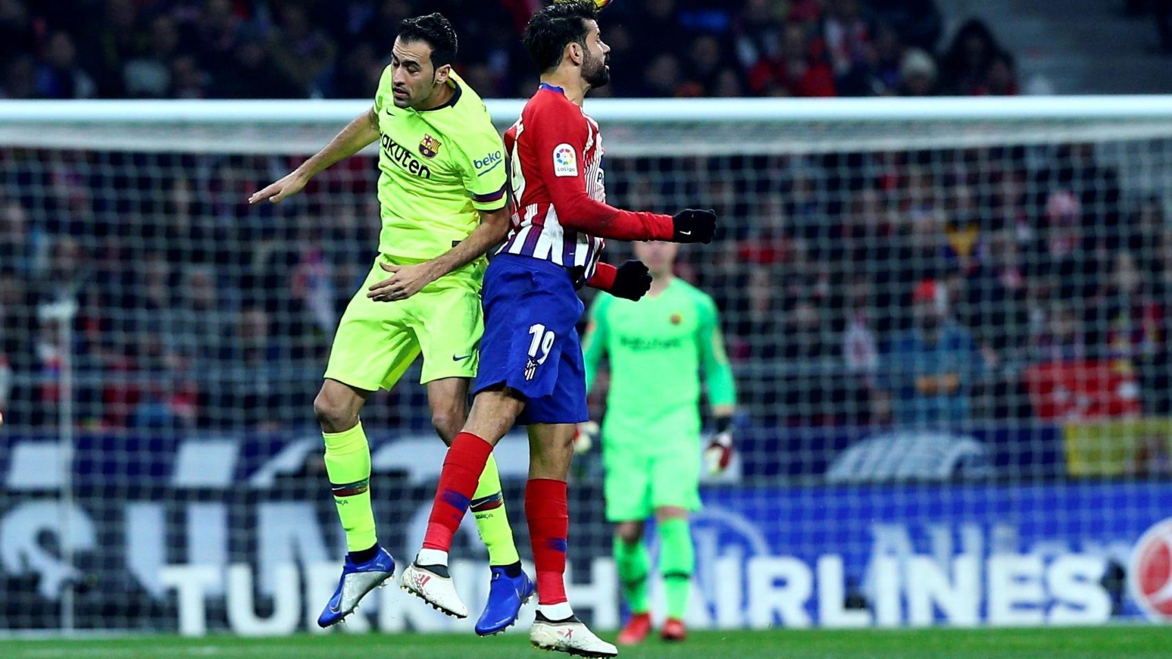 El delantero del Atlético de Madrid Diego Costa (i) y el defensa del FC Barcelona Gerard Piqué, durante el partido de Liga en Primera División que disputan esta noche en el estadio Metropolitano, en Madrid.