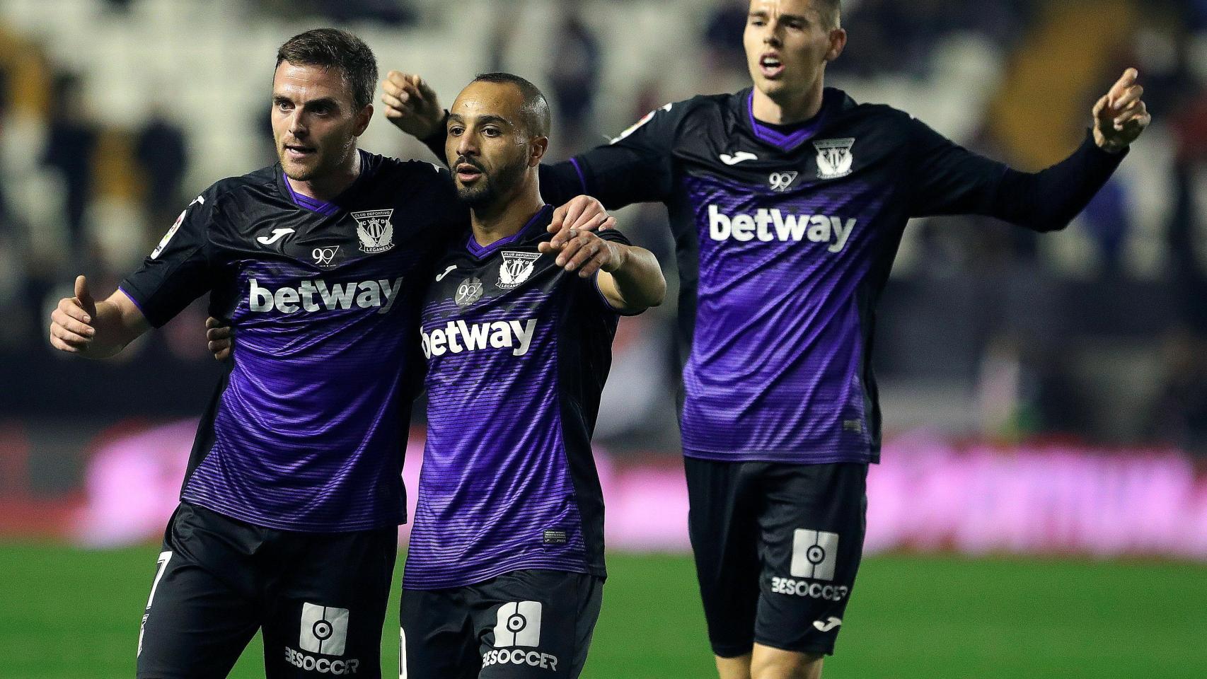 Los jugadores del Leganés celebran el primer gol del equipo ante el Rayo Vallecano.