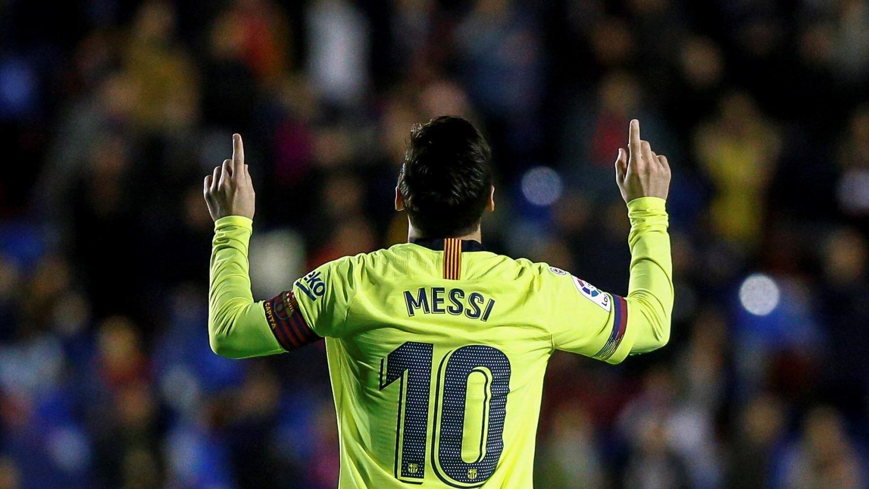 Leo Messi celebra un gol en el Ciudad de Valencia en el Levante 0-5 FC Barcelona