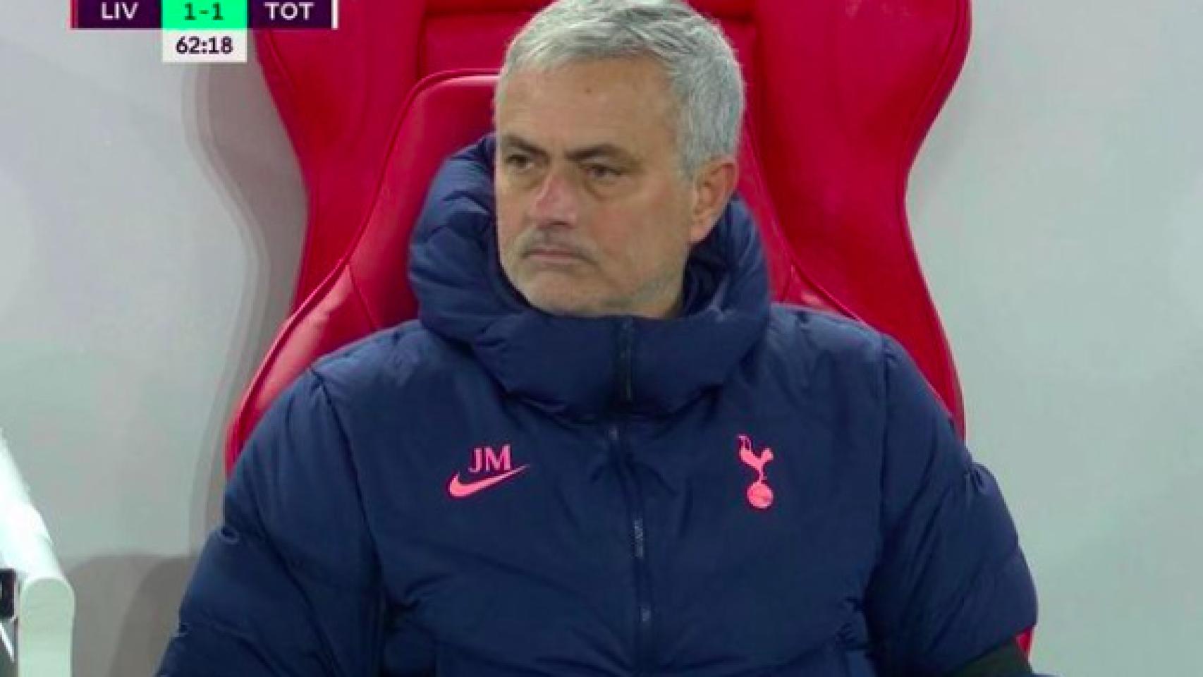 El Tottenham perdió en el 90' contra el Liverpool, pero tuvo en su mano la victoria. Mourinho mostró su resignación en redes sociales: "El momento en que el palo nos negó la victoria que merecíamos. Orgulloso de todos". La imagen es del momento en el que Bergwijn dio al palo derecho con 1-1 en el marcador.