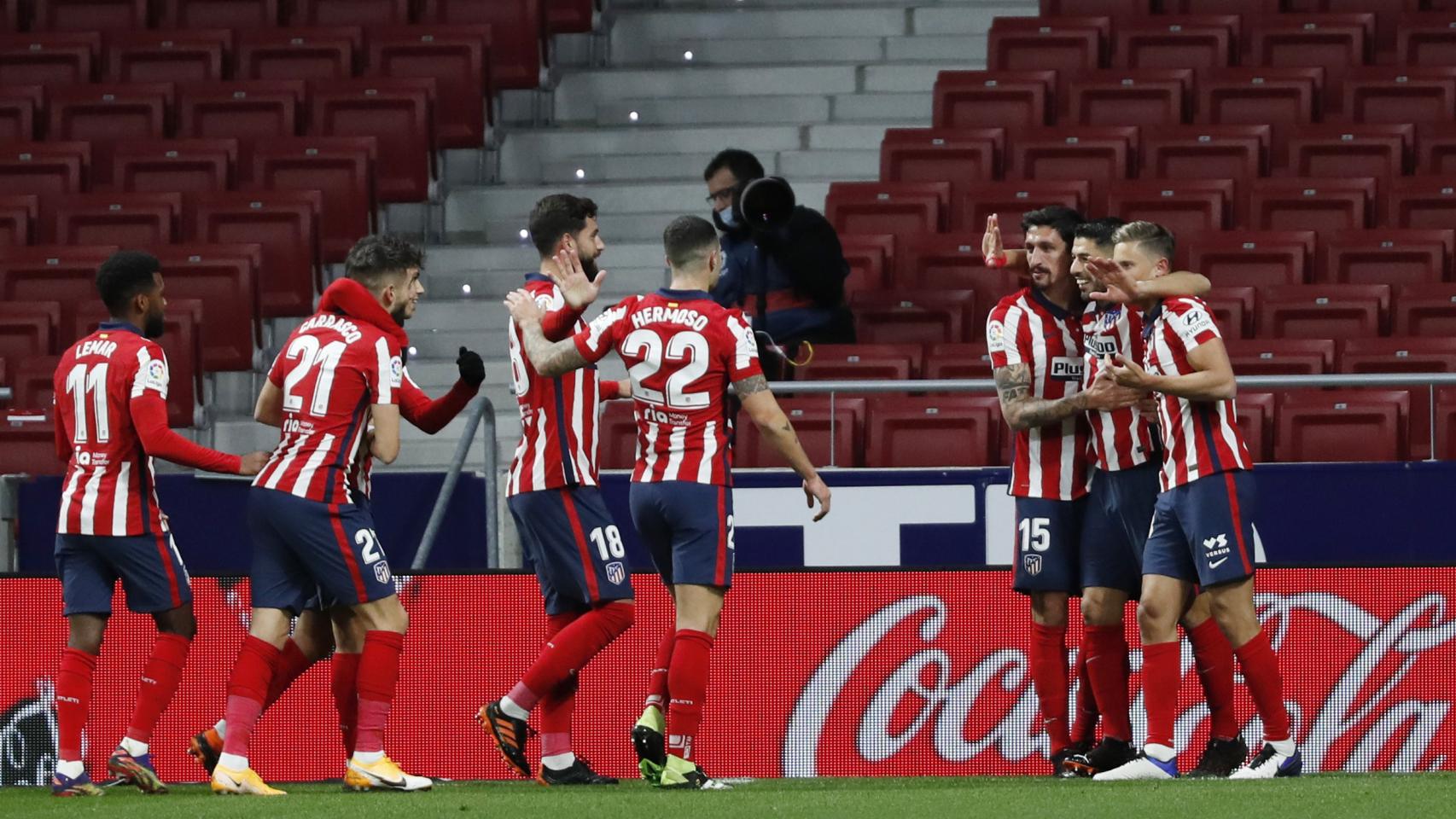 Celebración de los jugadores del Atlético de Madrid del gol de Luis Suárez