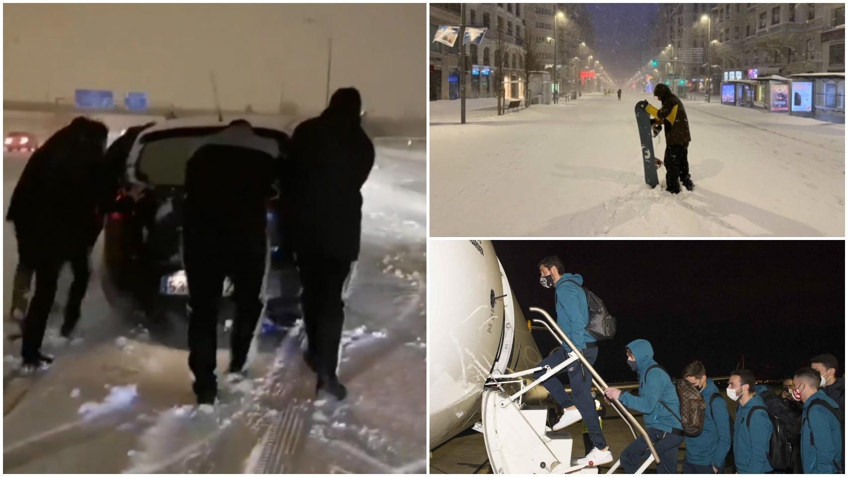 La aventura del Rayo dejó una imagen sorprendente. Con los coches atrapados en la nieve, los jugadores se bajaron del autobús y ayudaron a rescatar a algunos vehículos.