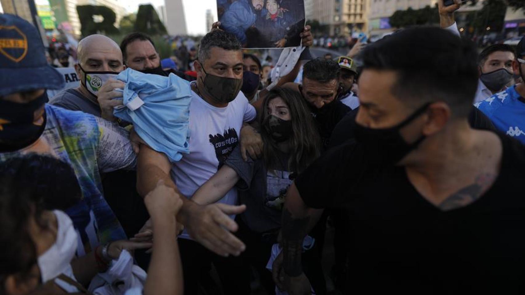 Dos aficionados, emocionados, durante la protesta a favor de Maradona