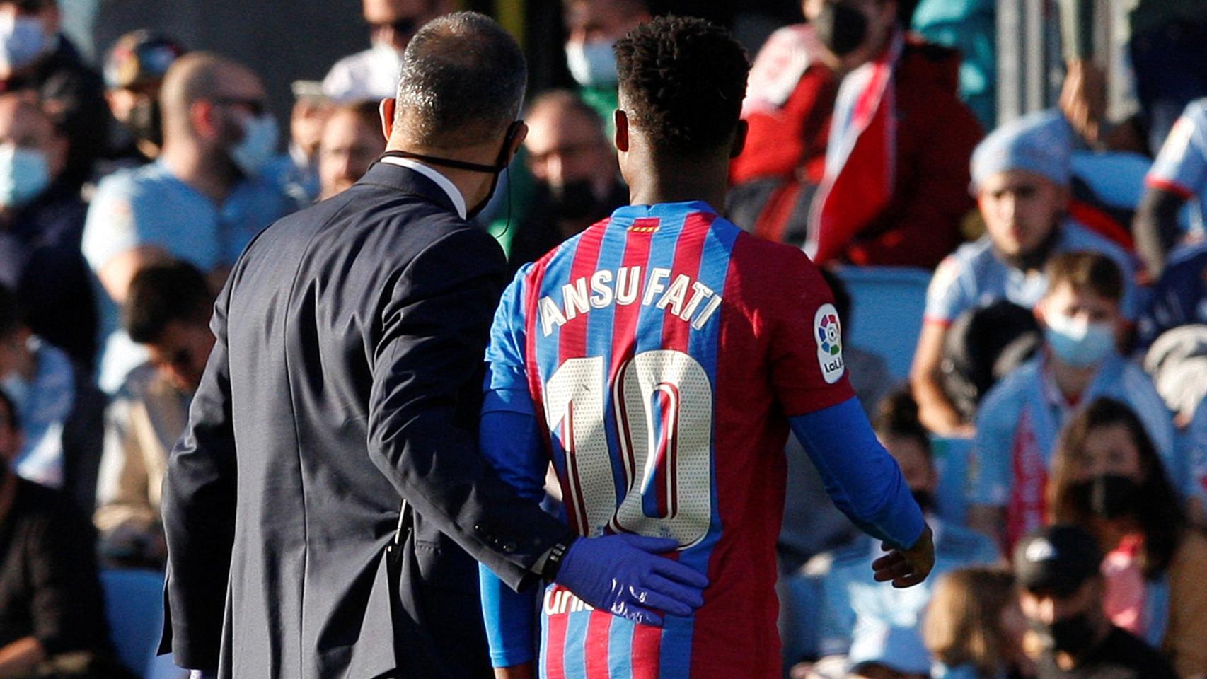 Ansu Fati en el suelo tras caer lesionado ante el Celta