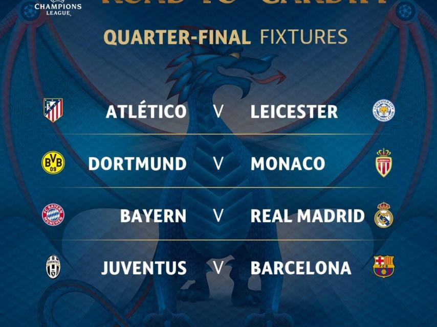 Así quedan los cuartos de final de la Champions League: Atlético de Madrid - Leicester, Borussia Dortmund - Mónaco, Bayern de Múnich - Real Madrid y Juventus - Barcelona.