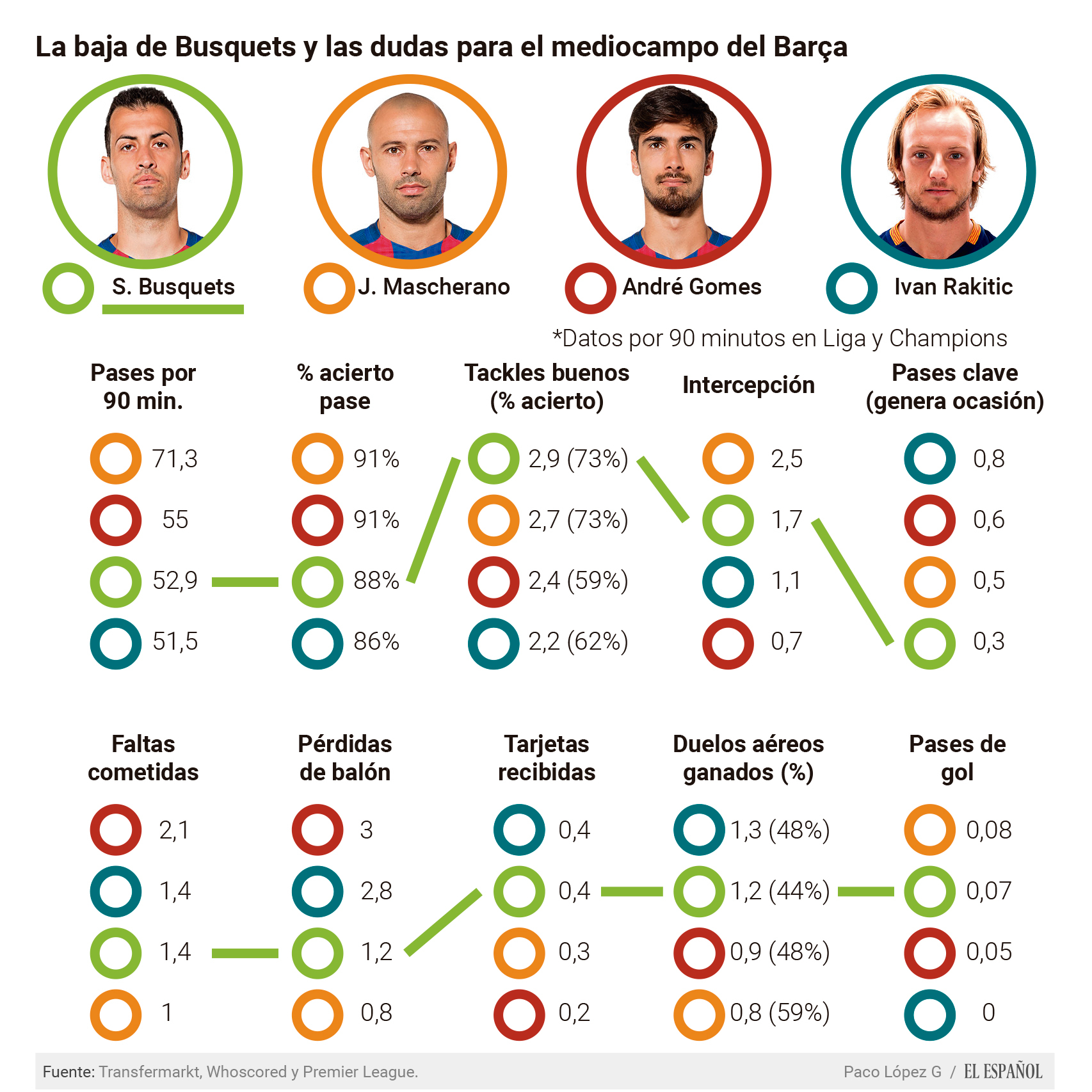 Esta situación es un círculo vicioso: el estilo de Luis Enrique impide la mejor versión de Busquets quien tiene que esforzarse más físicamente y la escasez de plantilla no permite rotarle cansándole más aún. En esta búsqueda constante de una pareja de interiores que contente a Luis Enrique, la única certeza en el medio es que Busquets, incluso en un mal momento y perdiendo influencia con el balón, es el punto de partida para ordenar los ataques. Sin balón continúa siendo quien más importancia tiene en la recuperación, con el 16% de las entradas y el 15% de las intercepciones del total del Barcelona este año (datos que estaban en 19% y 21% la última vez que el club ganó la Champions).