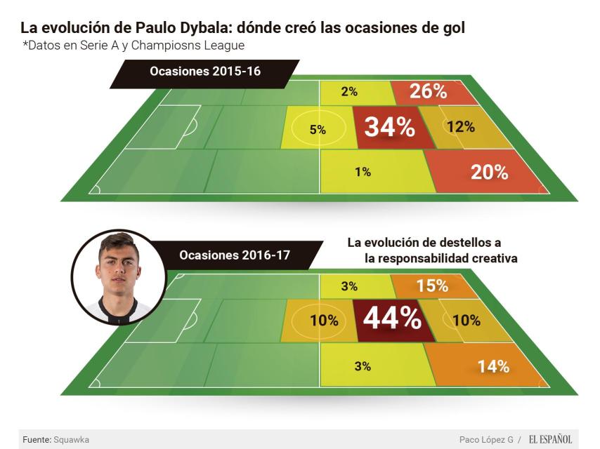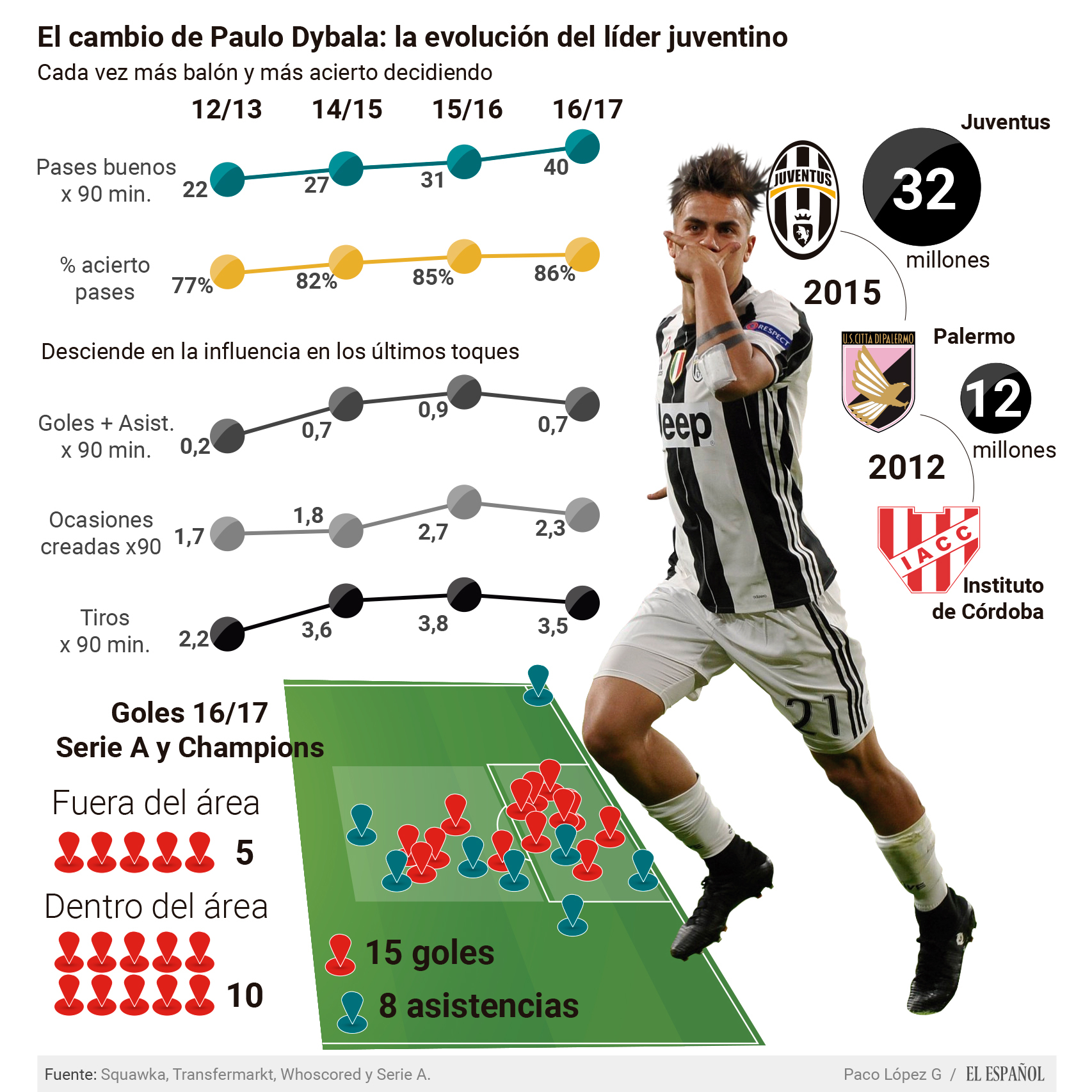La comparación con Messi se entiende pero Dybala está lejos de esas cifras de cara a puerta. Una evolución del delantero centro ágil que llegó a Palermo al cerebro ofensivo de un finalista de Champions.